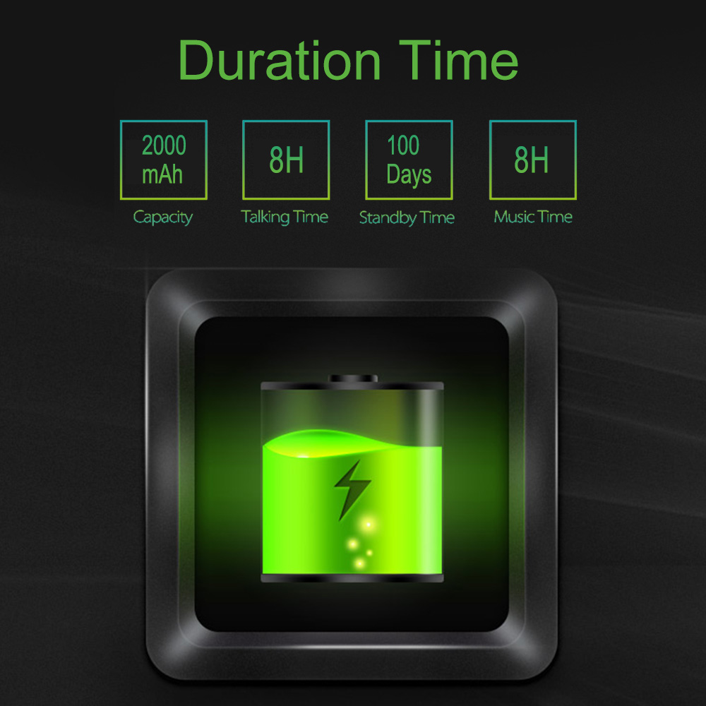 Встроенная Li-Ion 2000 мАч аккумуляторная батарея гарантирует до 8 часов использования и 100 дней в режиме ожидания. Подзарядка всего 2-3 часа с включенным микро USB кабелем.