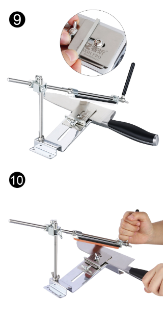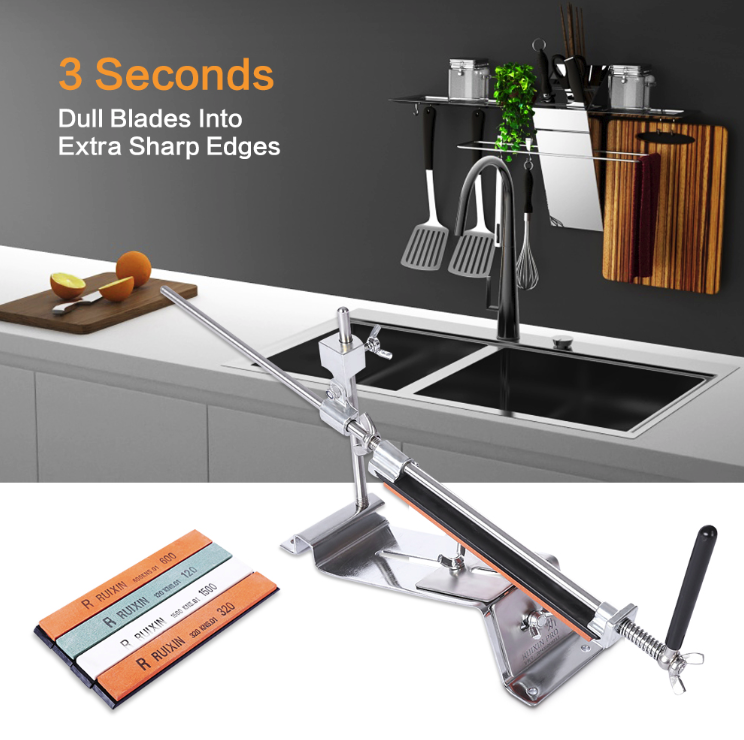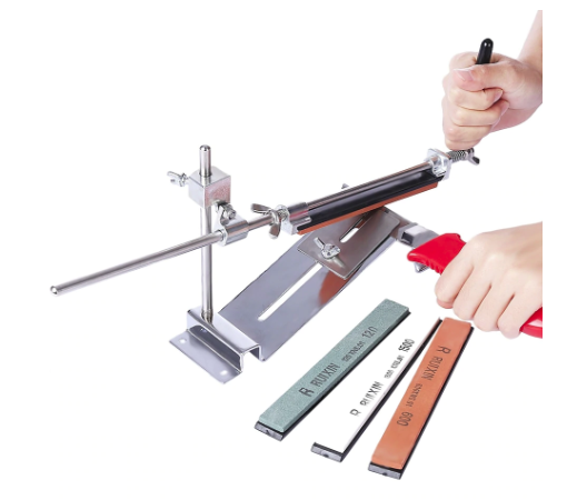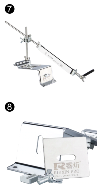 Комплектация: станина с 2мя прикрученными пластинами, 3 камня, вертикальная направляющая, разборная (из 2х элементов) горизонтальная направляющая, рукоятка, распорка, болт с 2 шайбами и шестигранный ключ на 4мм. 3 камня: 120, 600, 1500 grit.