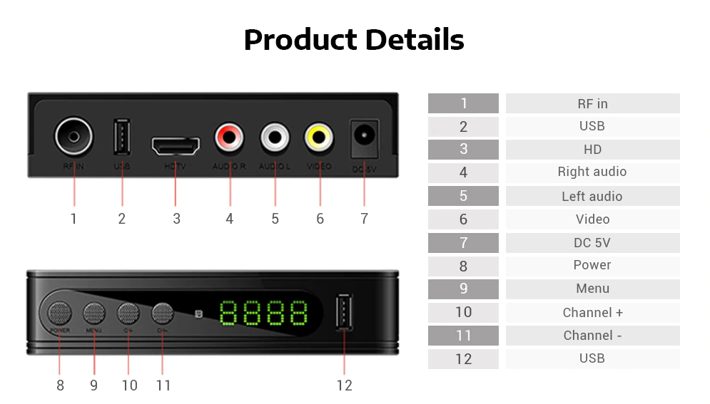 | Посылка содержание | 1 Цифровой наземный приемник, 1 пульт дистанционного управления, 1 адаптер питания, 1 кабель переменного тока, 1 руководство на английском языке |